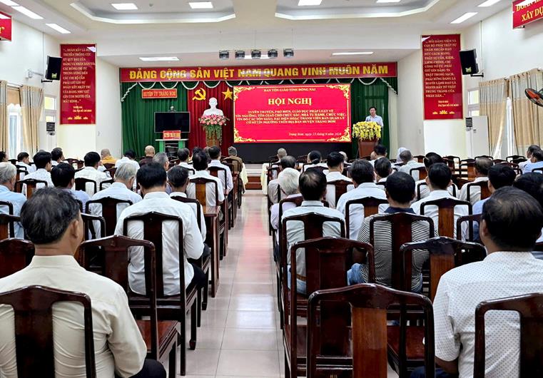(CTT-Đồng Nai) - UBND huyện Trảng Bom vừa tổ chức Hội nghị tuyên truyền phổ biến pháp luật về tín ngưỡng, tôn giáo cho trên 300 đại biểu là chức sắc, chức việc, nhà tu hành, tín đồ các tôn giáo, đại diện hoặc thành viên Ban quản lý cơ sở tín ngưỡng và cán bộ làm công tác quản lý nhà nước về tín ngưỡng, tôn giáo trên địa bàn huyện năm 2024.