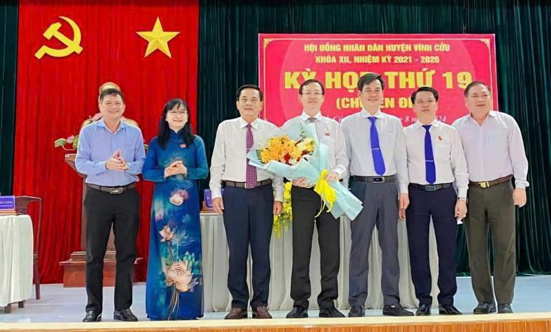 Lãnh đạo huyện Vĩnh Cửu trao hoa chúc mừng tân Phó Chủ tịch UBND huyện Lê Nguyễn Song Toàn