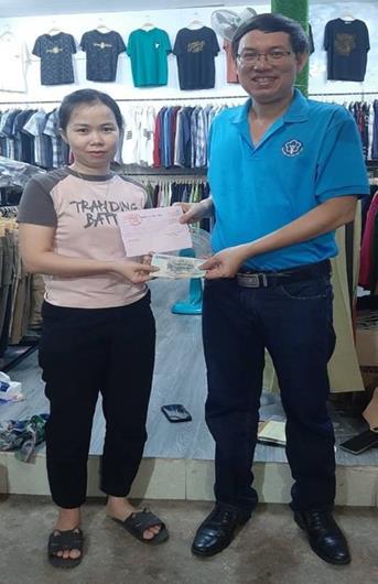 Bà Dương Thị Việt Hương, Phó Giám đốc Bưu điện tỉnh Đồng Nai vận động tiểu thương chợ Vĩnh An, huyện Vĩnh Cửu mua thẻ BHYT