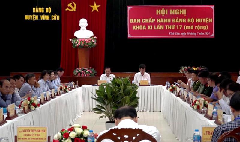 (CTT-Đồng Nai) - Huyện ủy Vĩnh Cửu tổ chức Hội nghị Ban Chấp hành Đảng bộ huyện khóa XI lần thứ 17 (mở rộng) nhằm thảo luận, đánh giá về công tác lãnh đạo, chỉ đạo, tình hình, kết quả thực hiện nhiệm vụ công tác trong 6 tháng đầu năm; xác định phương hướng, nhiệm vụ trọng tâm 6 tháng cuối năm 2024.