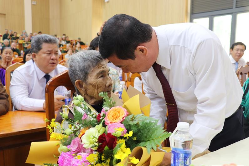 Bí thư Huyện ủy Vĩnh Cửu Lê Thành Mỹ tặng hoa tri ân Mẹ Việt Nam anh hùng Hồ Thị Vàng.