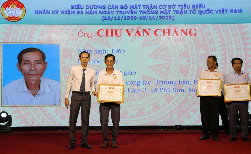 Ông Chu Văn Chăng, dân tộc Tày, Trưởng ban Công tác Mặt trận ấp Phú Lâm 3, xã Phú Sơn, H.Tân Phú nhận khen thưởng tại chương trình Họp mặt và biểu dương cán bộ Mặt trận cơ sở tiêu biểu nhân kỷ niệm 93 năm Ngày truyền thống MTTQ Việt Nam (18-11-1930 - 18-11-2023)