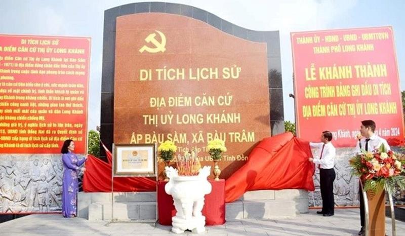 (CTT-Đồng Nai)- Hướng tới kỷ niệm 30-4 giải phóng hoàn toàn miền Nam, thống nhất đất nước, ngày 4-4 thành phố Long Khánh đã tổ chức khánh thành công trình Bảng ghi dấu Di tích lịch sử Địa điểm Căn cứ Thị ủy Long Khánh, tại tổ 7, ấp Bàu Sầm, xã Bàu Trâm.