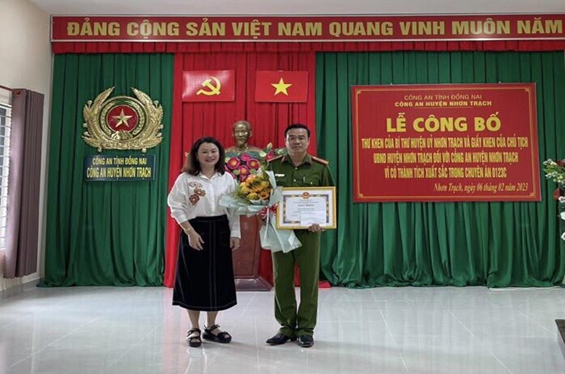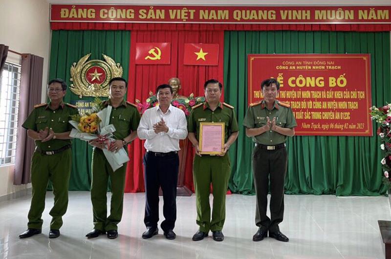 Nhân dịp này, Bí thư Huyện ủy Lê Thành Mỹ đã trao thư khen cho Đảng ủy Công an huyện. Chủ tịch UBND H.Nhơn Trạch Nguyễn Thị Giang Hương đã tặng giấy khen và thưởng nóng thêm 10 triệu đồng cho tập thể Công an huyện vì đạt thành tích xuất sắc trong Chuyên án 0123C.