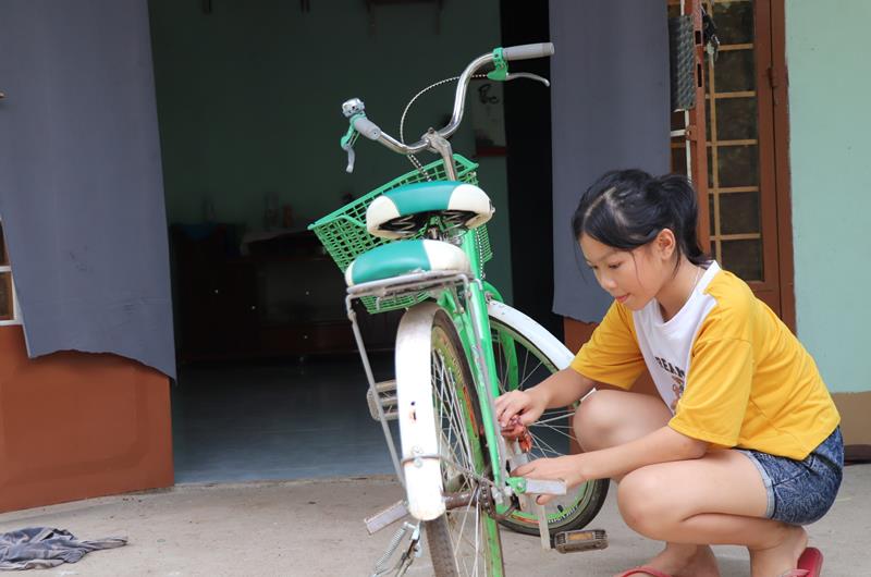Em Lý Thanh Hương, học sinh lớp 6 Trường THCS Bảo Quang (TP.Long Khánh) lau chùi chiếc xe đạp được tặng
