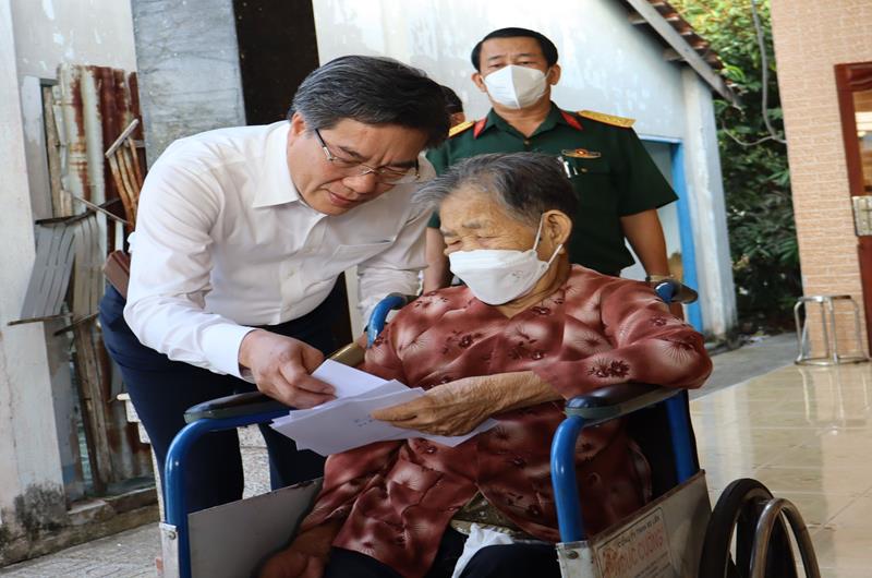 Ủy viên Ban TVTU, Bí thư Huyện ủy Long Thành Dương Minh Dũng tặng quà, động viên Mẹ Việt Nam anh hùng Nguyễn Thị Ra