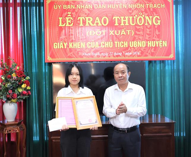 (CTT-Đồng Nai) - Chiều ngày 22 – 7, Lãnh đạo Huyện uỷ - UBND huyện Nhơn Trạch đã khen thưởng đột xuất cho em Phạm Ngọc Quỳnh Như – học sinh lớp 12A8 trường THPT Phước Thiền đã xuất sắc khi vừa là thí sinh có điểm cao nhất Kỳ thi tốt nghiệp THPT năm 2024 của tỉnh vừa là thí sinh có điểm cao nhất tổ hợp xét tuyển Đại học ở khối D.