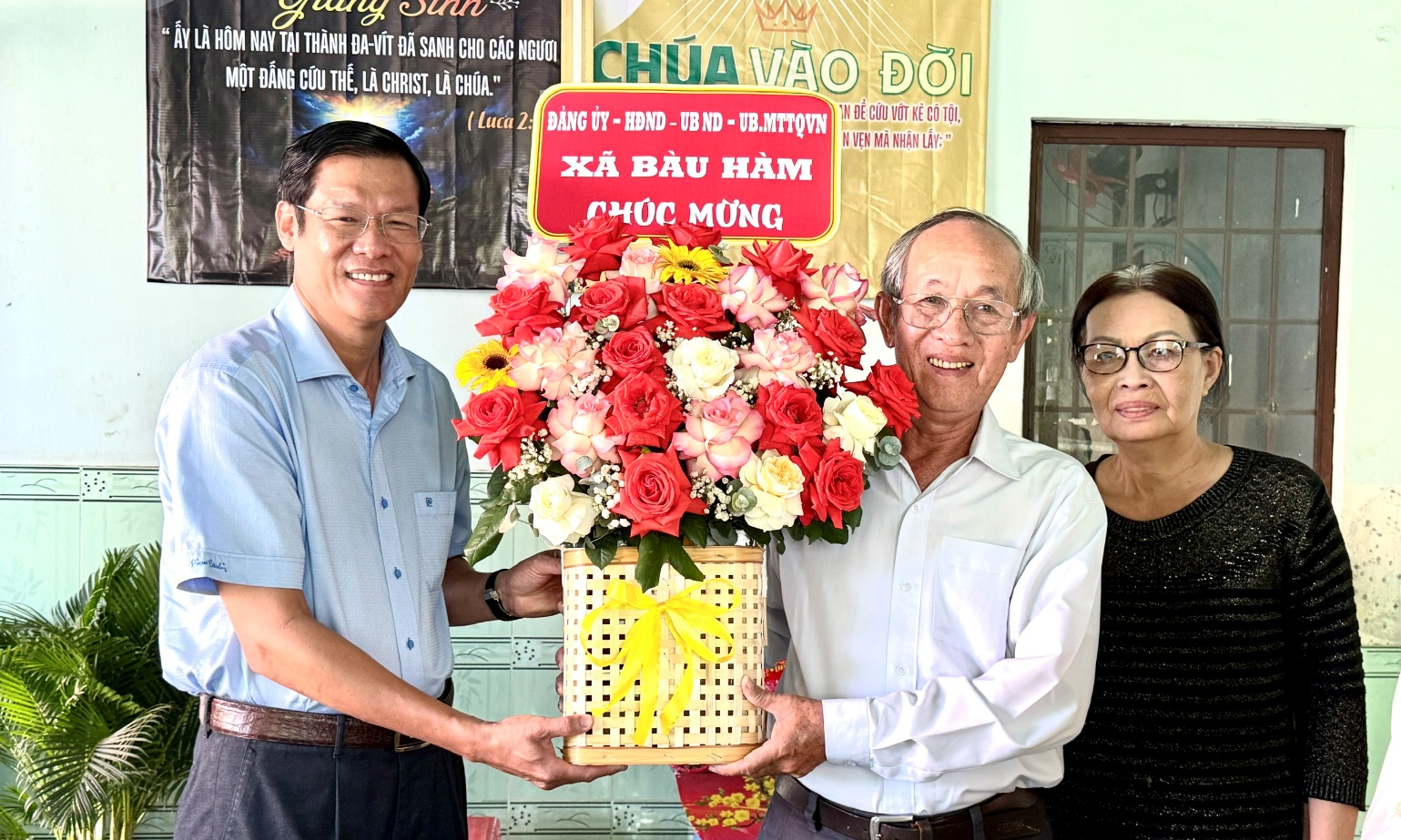 Ông Lê Huy Thiêm-Bí thư Đảng ủy, chủ tịch HĐND xã Bàu Hàm tặng hoa chúc mừng Mục sư Bùi Kinh Thường, Hội thánh tin lành Thanh Bình nhân dịp mừng lễ Giáng sinh năm 2025
