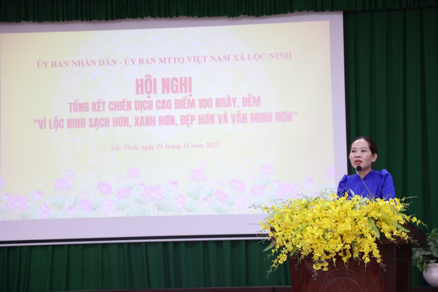 Phát biểu tại hội nghị, Chủ tịch UBND xã Nguyễn Thị Nghĩa đã ghi nhận nỗ lực của các đơn vị và Nhân dân trong quá trình thực hiện chiến dịch, đồng chí cũng nhấn mạnh: Chiến dịch 100 ngày, đêm không chỉ là phong trào ngắn hạn mà là bước khởi đầu quan trọng xây dựng nếp sống văn minh, hình thành thói quen giữ gìn môi trường và cảnh quan sạch đẹp, để Lộc Ninh ngày một khang trang hơn, trở thành vùng quê đáng sống hơn.