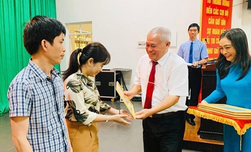 Đồng chí Phạm Văn Hoàng, Trưởng Ban Tuyên giáo Thành ủy, Giám đốc Trung tâm Chính trị thành phố Long Khánh trao giấy khen cho các học viên đạt loại giỏi.