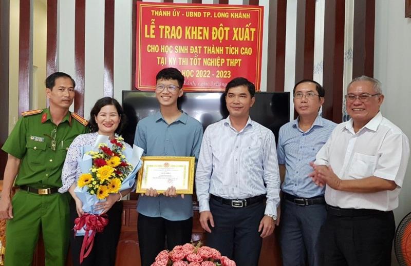 (CTT- Đồng Nai) - UBND TP Long Khánh vừa tổ chức lễ khen thưởng đột xuất cho nam sinh Vũ Hoàng Lương Huy ngụ TP.Long Khánh. Huy theo học bán trú tại trường THCS - THPT Nguyễn Khuyến (TP.HCM) và vừa qua đã xuất sắc đạt danh hiệu thủ khoa toàn quốc khối A1 tại Kỳ thi tốt nghiệp THPT năm học 2022 - 2023.