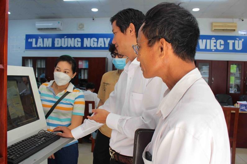 Cán bộ Bộ phận một cửa TP.Long Khánh hướng dẫn người dân thực hiện dịch vụ công trực tuyến