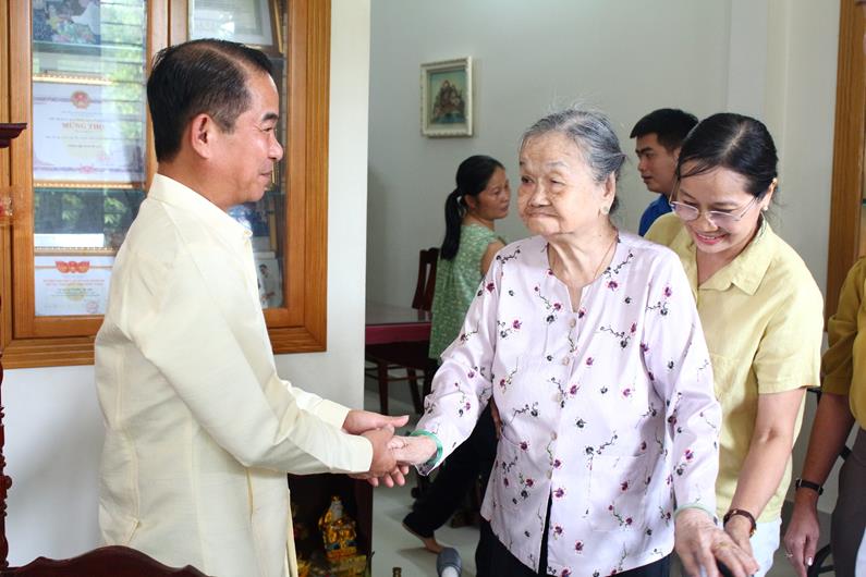 Ủy viên Ban Thường vụ Tỉnh ủy, Chủ tịch HĐND tỉnh Thái Bảo (bìa trái) hỏi thăm sức khỏe Bà mẹ Việt Nam anh hùng Lê Thị Nở (ngụ xã Long Thọ, huyện Nhơn Trạch)