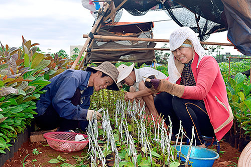 Bà Phương hướng dẫn kỹ thuật ghép cây giống cho bà con ở địa phương.