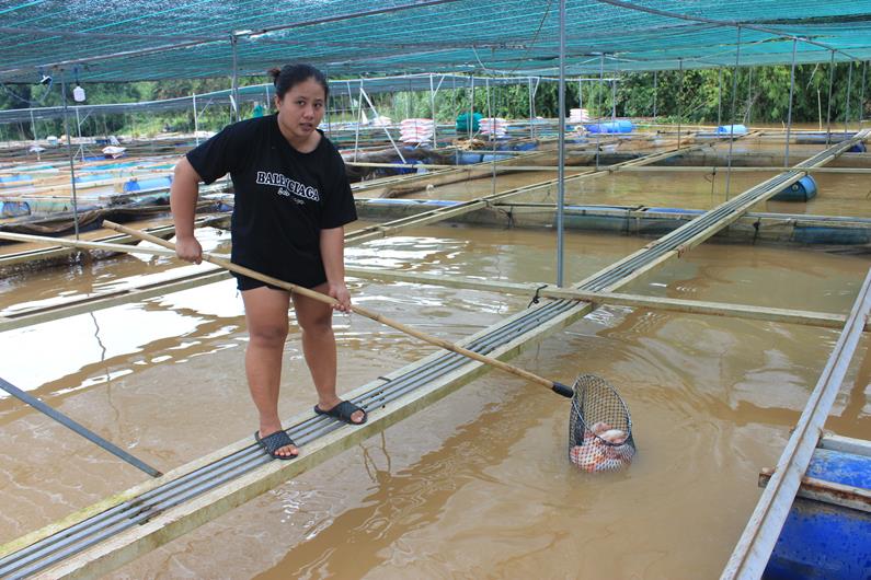Thương lái thu mua cá chết tại các bè cá ở xã Thanh Sơn, H.Định Quán