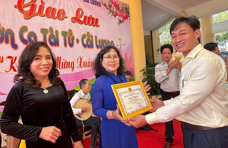 Trung tâm Văn hóa, Thông tin và Thể thao huyện Long Thành trao giấy khen cho nghệ nhân Linh Phụng, Chủ nhiệm Câu lạc bộ đờn ca tài tử Long Thành