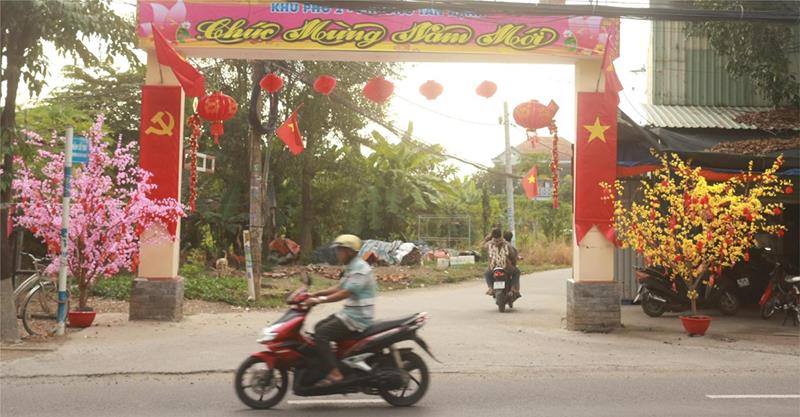 Cũng theo ông Bùi Chi Lăng, mọi năm khu phố đều có đợt ra quân chỉnh trang đường sá để đón Tết. Năm nay, để tạo không khí vui tươi hơn, khu phố lên ý tưởng và cùng bà con trang trí Tết ngay cổng chào của khu phố. Ngoài cờ Đảng, cờ Tổ quốc, biểu ngữ chúc mừng năm mới, bà con khu phố còn dựng thêm cây đào, cây mai giả với kích thước lớn cùng nhiều phụ kiện khác. Đến thời điểm gần Tết, bà con sẽ dựng thêm cây nêu, bày trí thêm một số phụ kiện…