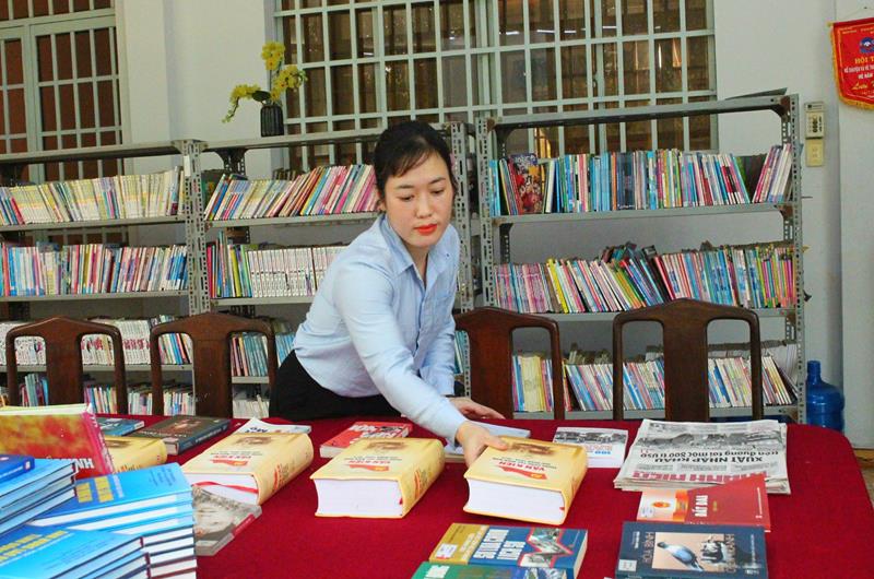 Chị Cao Thị Bảo Trung, cán bộ thư viện H.Long Thành đang sắp xếp lại phòng trưng bày sách, phục vụ bạn đọc