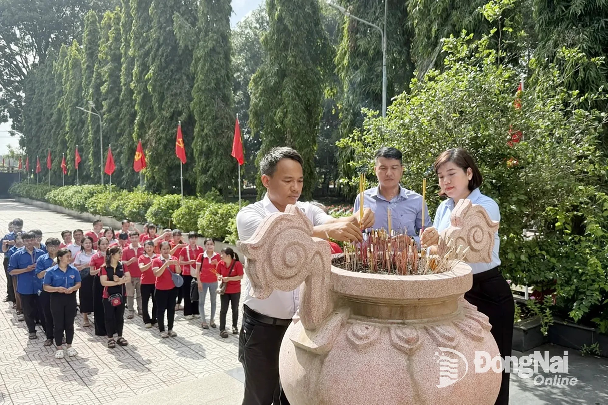 Đoàn viên thanh niên xã Tân Khai và các đơn vị thắp hương tượng đài và ra quân vệ sinh Nghĩa trang Bình Long. Ảnh: Thanh Lâm