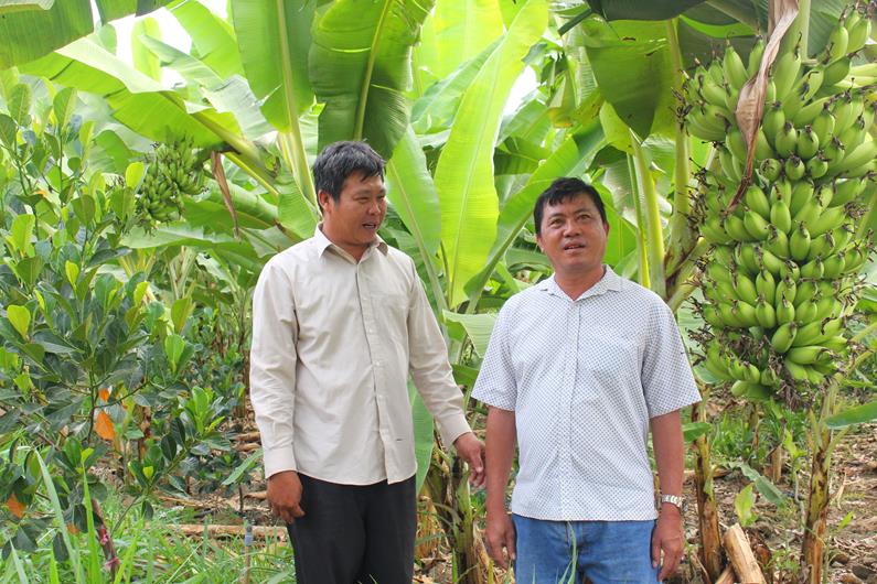 Ông Ngàn A Phước trao đổi với người dân trong tổ về kinh nghiệm trồng chuối