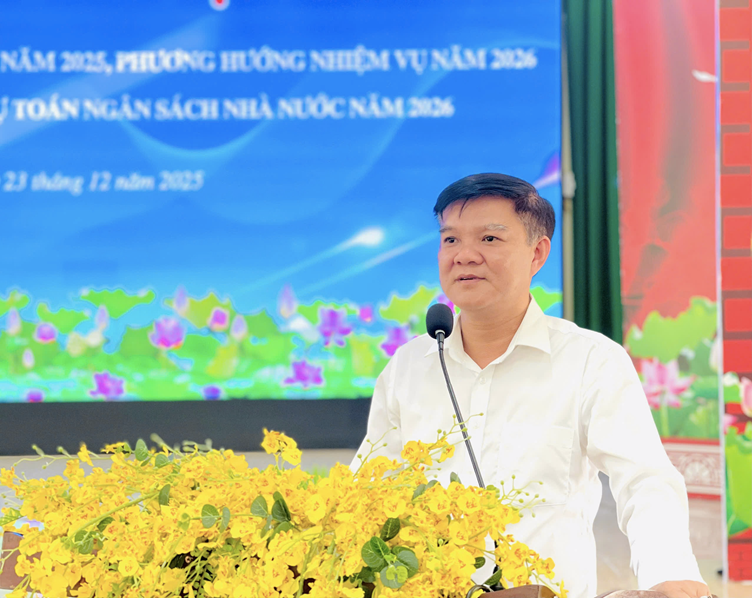 Bí thư Đảng uỷ xã Nguyễn Trung Dũng phát biểu tại Hội nghị đánh giá kết quả thực hiện nhiệm vụ năm 2025 và giao chỉ tiêu phát triển kinh tế – xã hội, dự toán chi ngân sách nhà nước năm 2026. Ảnh: Huyền Trang