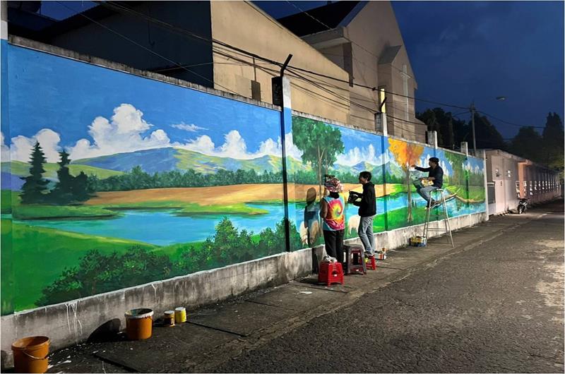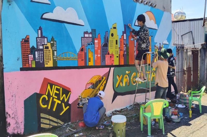 Đội ngũ giáo viên, sinh viên Đoàn Trường cao đẳng trang trí Mỹ thuật Đồng Nai vẽ tranh trên tường ở các tuyến đường thuộc ấp Dốc Mơ 1, xã Gia Tân 1, H.Thống Nhất. Ảnh: Phan Anh