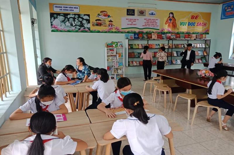 Học sinh trên địa bàn xã Bình Hòa đọc sách tại mô hình Ngôi nhà trí tuệ của xã