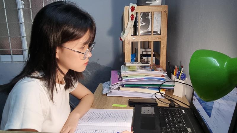 Nguyễn Bảo Ngân, học sinh lớp 9A5 Trường THCS Phú Túc, xã Phú Túc, H.Định Quán bên góc học tập của mình