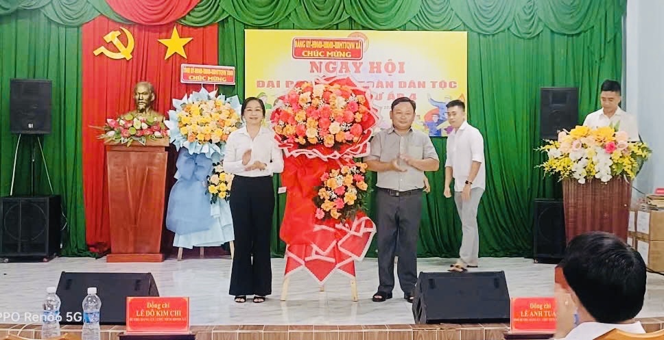 Đồng chí Lê Đỗ Kim Chi, Bí thư Đảng ủy, Chủ tịch HĐND xã trao tặng lãng hoa chúc mừng ngày hội Đại Đoàn kết toàn dân tộc tại Nhà văn hóa ấp 4