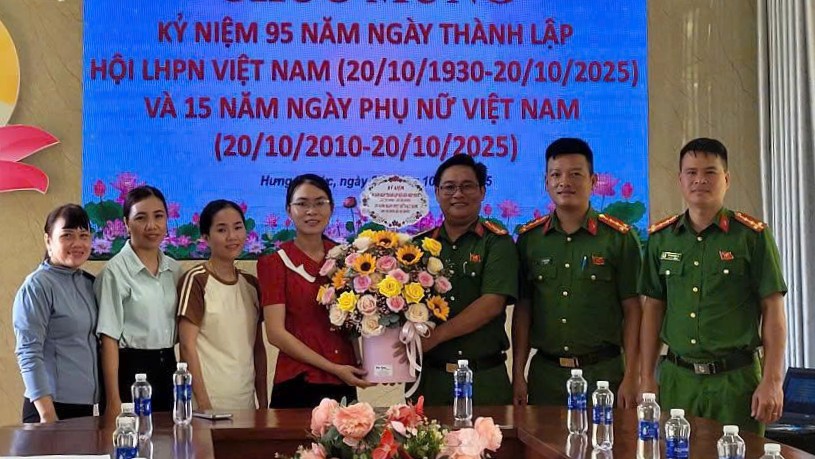 Công an xã Hưng Phước tặng hoa chúc mừng Hội Liên hiệp Phụ nữ xã