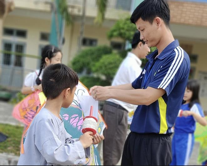 Một thầy giáo Trường tiểu học Phú Điền đang buộc dây diều cho học sinh thả diều sau giờ tan trường