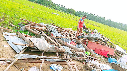 Trận gió lốc xoáy chiều 29-5 cũng đã khiến cho căn nhà của ông Cao Xuân Hậu (50 tuổi, tổ 8, ấp 3) sập đổ và làm hư hỏng nhiều tài sản khác, như: ti vi, dàn karaoke, tủ đựng đồ, giường ngủ… Tổng thiệt hại khoảng 100 triệu đồng. Hiện gia đình ông đang che chắn ở tạm tại chuồng heo. “Chiều 29-5, nếu gia đình tôi có ở nhà thì có lẽ… Hôm đó, vợ chồng tôi đi làm mướn chưa về, còn thằng con đi qua nhà hàng xóm chơi nên không có ai ở nhà. Khi nghe bà con hàng xóm báo tin, vợ chồng tôi chạy về thì chỉ còn đống đổ nát”, bà Cao Thị Bình (50 tuổi, vợ ông Hậu) ngậm ngùi kể lại.