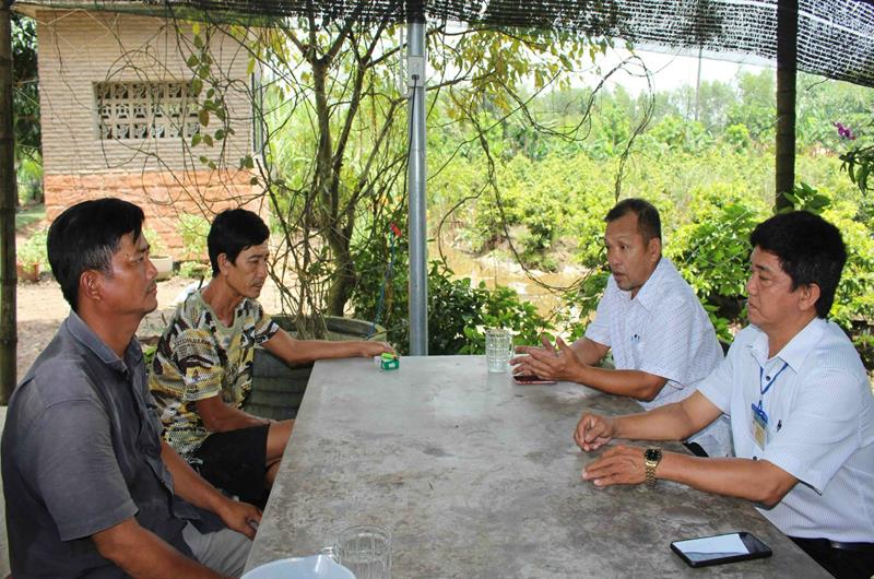 Cán bộ ấp 1 và Hội nông dân xã Tam An cùng các thợ chăm sóc mai đang trao đổi kinh nghiệm tại khu vườn mai của ông Nguyễn Vui.