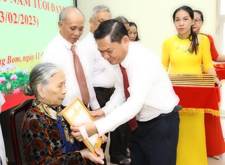Bí thư Huyện ủy Trảng Bom Lê Tuấn Anh trao Huy hiệu Đảng cho đảng viên