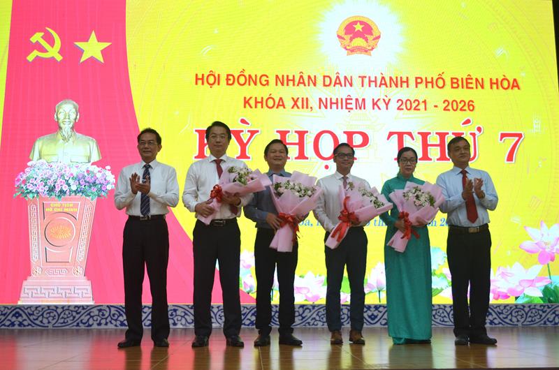 Lãnh đạo TP.Biên Hòa chúc mừng các đồng chí được bầu vào các chức danh của UBND thành phố theo quy định và ghi nhận những đóng góp của nguyên Chủ tịch UBND TP.Biên Hòa Nguyễn Hữu Nguyên.