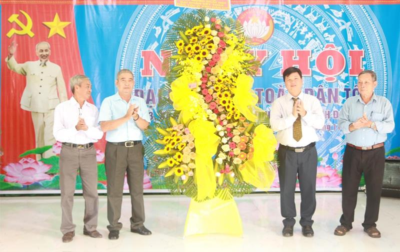 Phó Chủ tịch Ủy ban MTTQ Việt Nam tỉnh Vũ Đình Trung tặng hoa, quà của Tỉnh ủy - HĐND - UBND - Ủy ban MTTQ Việt Nam tỉnh cho tập thể ấp 3 (xã Suối Nho, huyện Định Quán) tại Ngày hội Đại đoàn kết toàn dân tộc.