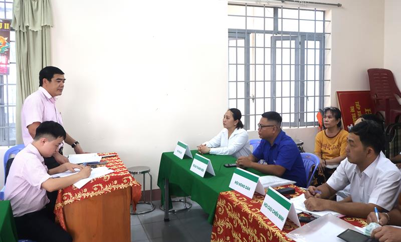 Giám đốc Phòng giao dịch NHCSXH Nhơn Trạch Nguyễn Tấn Đạt trao đổi với các hội, đoàn thể xã tại điểm giao dịch Hiệp Phước