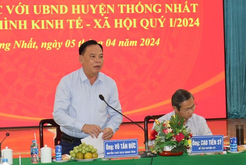 (CTT-Đồng Nai) - Ngày 5-4, đoàn công tác của UBND tỉnh do Quyền Chủ tịch UBND tỉnh Võ Tấn Đức làm trưởng làm việc với huyện Thống Nhất về tình hình kinh tế - xã hội quý I.