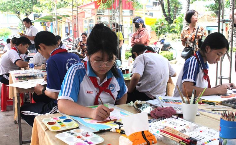 Các em học sinh trên địa bàn thành phố Biên Hòa tham gia phần thi vẽ tranh