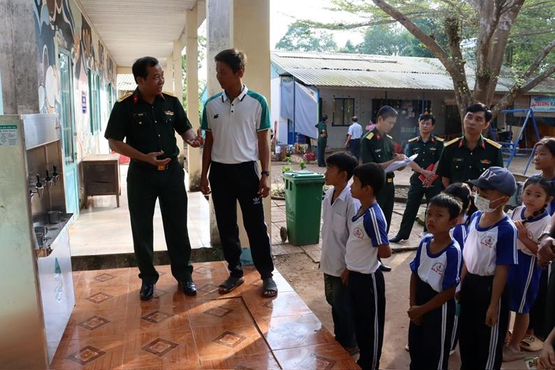 Đại tá Vũ Văn Điền hướng dẫn thầy, trò điểm trường tiểu học ấp 4 Mã Đà sử dụng hệ thống nước sạch do lực lượng vũ trang tặng