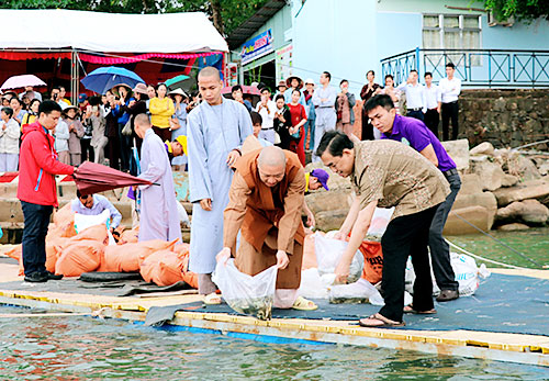 Chủ tịch Ủy ban Mặt trận Tổ quốc Việt Nam tỉnh Huỳnh Văn Tới (bên phải) và Thượng tọa Thích Thiện Thuận (trụ trì Viện Chuyên tu) cùng thả cá giống xuống hồ Trị An.