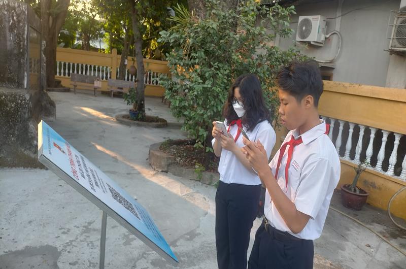 Các em học sinh quét mã QR tại di tích Lăng mộ Trịnh Hoài Đức, P.Trung Dũng, TP.Biên Hòa