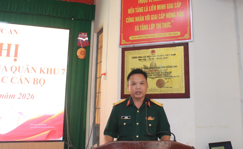 Thiếu tá Hồ Anh Vũ, Chỉ huy trưởng Ban Chỉ huy Quân sự xã phát biểu tại buổi Lễ