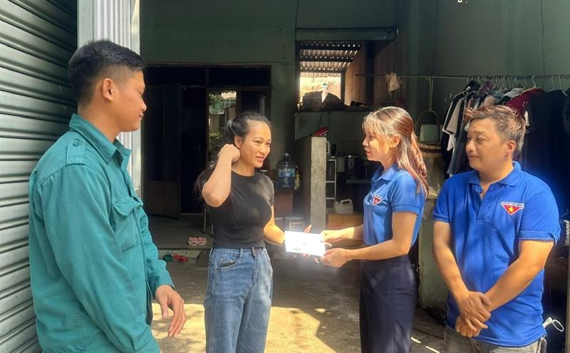 Chị Ngô Thị Hoàng (thứ 2 từ phải qua) tặng quà cho thanh niên có hoàn cảnh khó khăn