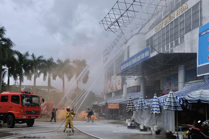 Các lực lượng chữa cháy tiếp cận đám cháy giả định từ mặt trước chợ Biên Hòa