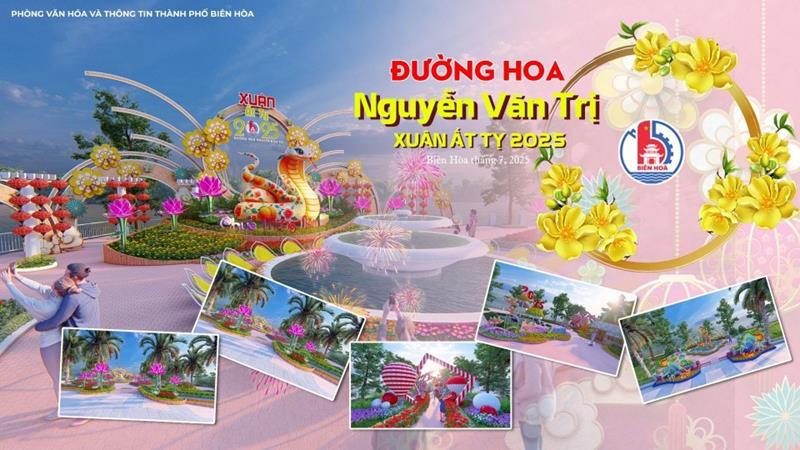 Với chủ đề: Thành phố Biên Hòa - vững tin, thịnh vượng và phát triển, đường hoa Nguyễn Văn Trị tết Nguyên đán Ất Tỵ dự kiến sẽ khai mạc ngày 25-1-2025, đoạn từ giao lộ Hoàng Minh Châu - Nguyễn Văn Trị đến cầu mới Hóa An với tổng chiều dài gần 600m.