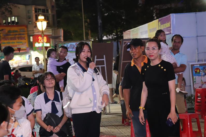 Học sinh tham gia trả lời câu hỏi giao lưu tại toạ đàm “Phát triển văn hoá đọc - học tập suốt đời”