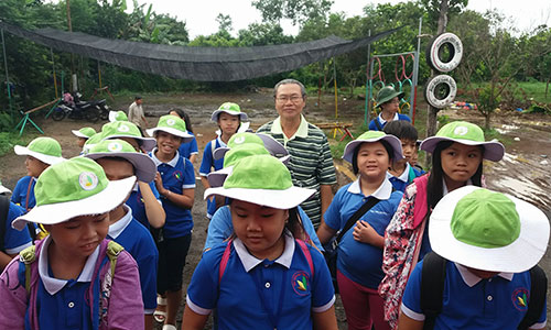 Nhà văn Nguyễn Thái Hải cùng thiếu nhi tham quan vườn trái cây Dì 2 tại TX. Long Khánh.