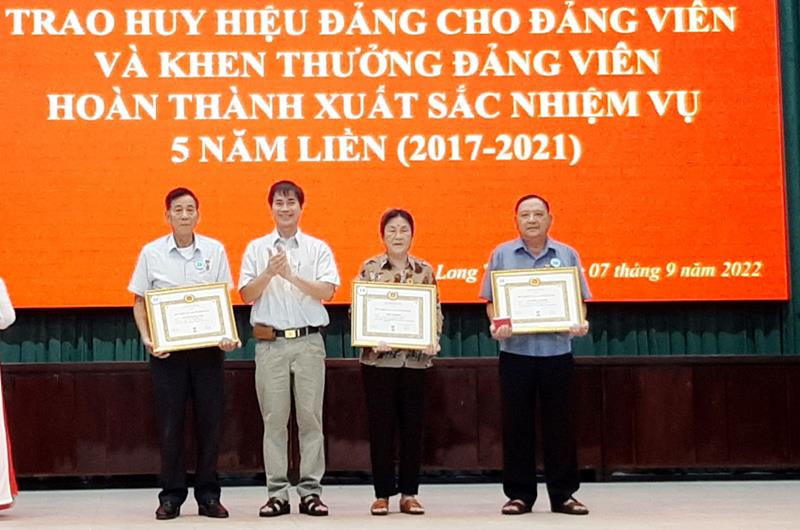 Lãnh đạo Ban Tuyên giáo Huyện ủy Long Thành trao huy hiệu đảng cho các đảng viên