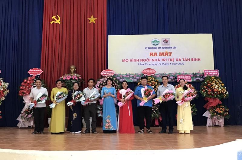 Phó Chủ tịch UBND H.Vĩnh Cửu Nguyễn Thị Dung tặng hoa cho Ban điều hành Ngôi nhà trí tuệ Việt Nam tham dự lễ ra mắt